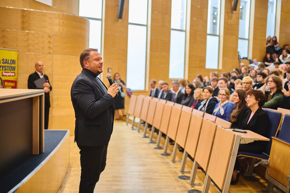 – Skoro tu jesteście, to znaczy, że nie chcecie być tylko influencerami czy youtuberami, ale chcecie mieć konkretny zawód – mówił Damian Łukasik, zastępca dyrektora Wojewódzkiego Urzędu Pracy, który polecił zebranym opublikowany na stronie urzędu barometr zawodów i test kompetencji: – Barometr pokazuje, jakie zawody będą pożądane w przyszłości, a test kompetencji wskaże wasze mocne strony. Wybierajcie kierunki przyszłościowe, ale łączcie je ze swoją pasją. Dzięki temu będziecie z zaangażowaniem wykonywać przyszły zawód.